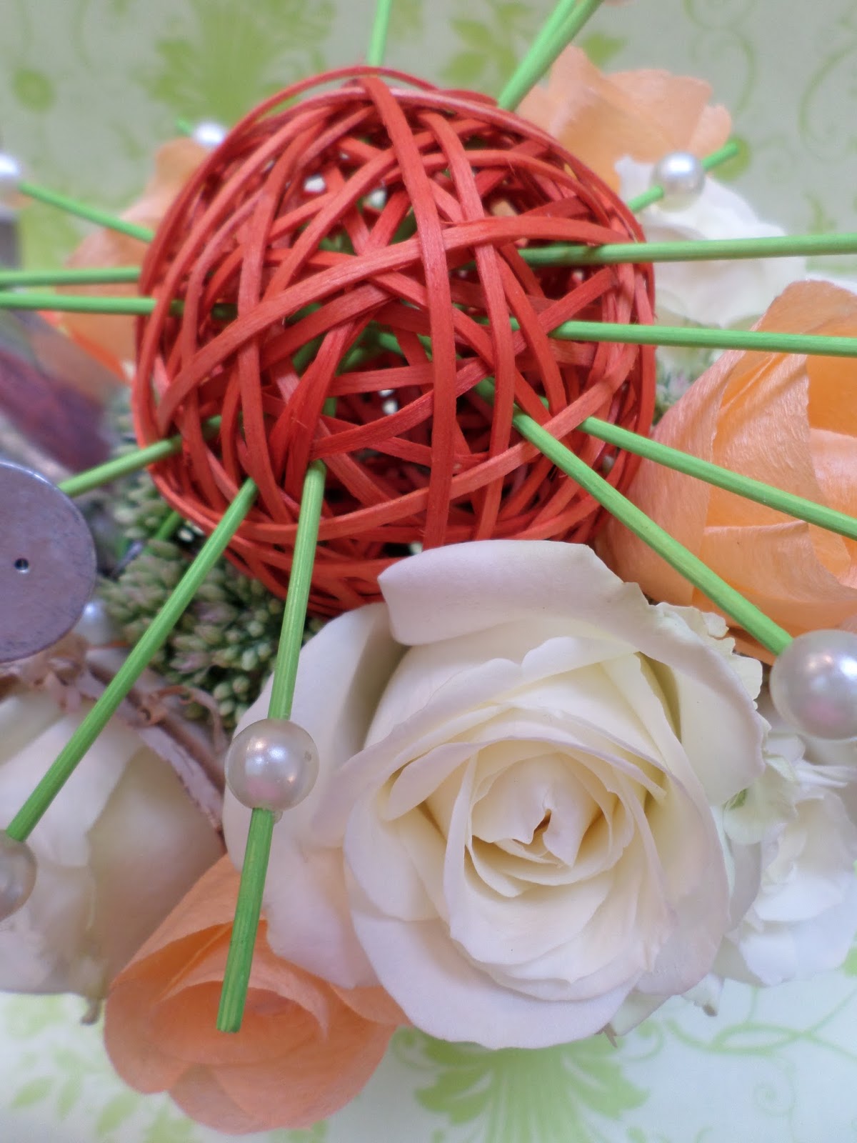 Ce bouquet de mariée se voulait, original, assorti à la couleur corail et surtout surprise ! En effet il était présenté dans une boîte fermée car offert à la mariée par ses amies. |